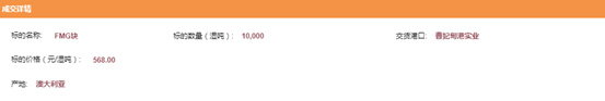 11月21日, 10000噸FMG塊以568元/濕噸的價格在平臺港口D板塊(曹妃甸港)成交,這是FMG直銷人民幣港口現貨在平臺的首單成交。
