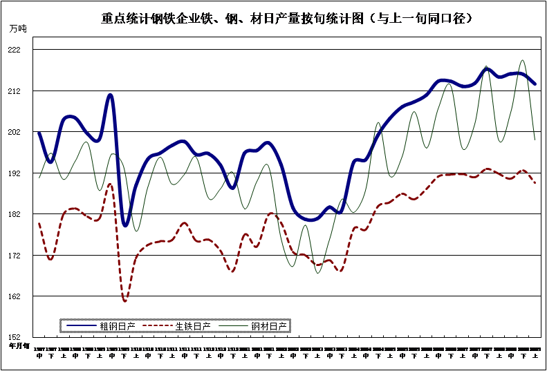 本月重點(diǎn)統(tǒng)計(jì)鋼鐵企業(yè)累計(jì)平均日產(chǎn)粗鋼213.66萬噸,環(huán)比下降0.55%、同比增長(zhǎng)6.73%;生鐵189.62萬噸,環(huán)比下降1.08%、同比增長(zhǎng)4.82%;鋼材199.93萬噸,環(huán)比下降4.35%、同比增長(zhǎng)6.50%。