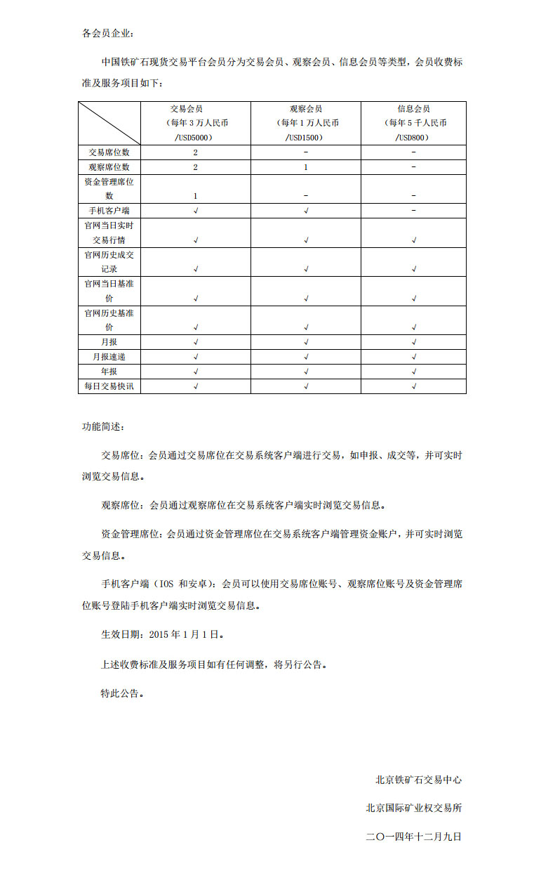 關(guān)于中國(guó)鐵礦石現(xiàn)貨交易平臺(tái)會(huì)員年費(fèi)收費(fèi)標(biāo)準(zhǔn)及服務(wù)項(xiàng)目的公告