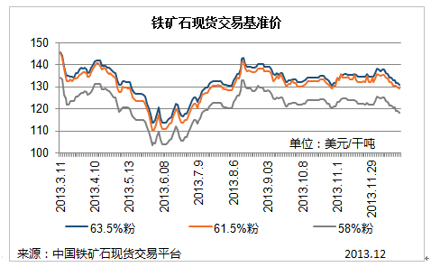 與上年同期鐵礦石價格大幅拉升相比,今年12月以來鐵礦石現(xiàn)貨價格呈現(xiàn)下降趨勢。根據(jù)中國鐵礦石現(xiàn)貨交易平臺基準(zhǔn)價12月23日數(shù)據(jù),63.5%粉美元價格從月初的$134.54/噸降至$130.77/噸,降幅達2.9%,61.5%粉及58%粉美元價格降幅分別為2.3%和3.2%。