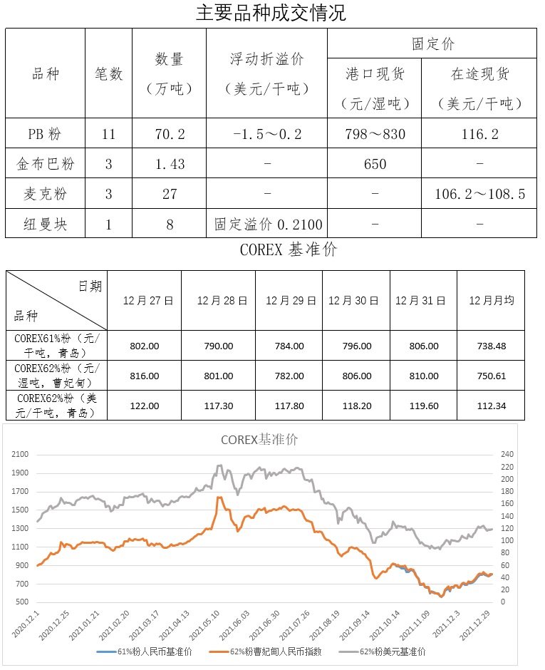 12月27日-12月31日成交30筆共131.16萬(wàn)噸,其中在途11筆111.5萬(wàn)噸,港口19筆19.66萬(wàn)噸。