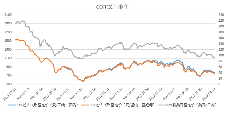 COREX62%粉(元/濕噸,曹妃甸)