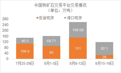 8月15日-8月19日成交110筆共120.1萬噸,其中在途3筆共28萬噸,港口107筆共92.1萬噸。主要成交品種包括:PB粉34筆共34.55萬噸,麥克粉13筆共25.3萬噸,金布巴混合粉11筆17.23萬噸,BRBF5筆6.67萬噸,FMG混合粉11筆共11.2萬噸,FMG超特粉7筆5.43萬噸。
