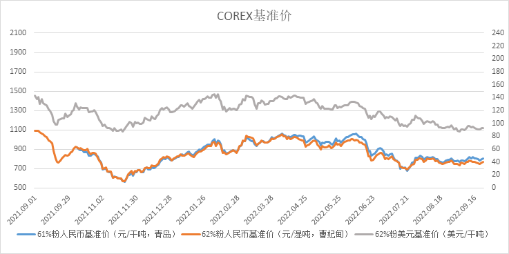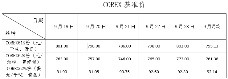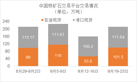 9月19日~9月23日成交105筆共213.14萬(wàn)噸,其中在途8筆共101.5萬(wàn)噸,港口97筆共111.64萬(wàn)噸。主要成交品種包括:PB粉28筆共69.87萬(wàn)噸,金布巴混合粉17筆共20.49萬(wàn)噸,麥克粉13筆共24.71萬(wàn)噸,F(xiàn)MG超特粉3筆共4.1萬(wàn)噸,F(xiàn)MG混合粉4筆共4.02萬(wàn)噸, BRBF 1筆共17萬(wàn)噸,卡拉加斯粉2筆共2萬(wàn)噸。