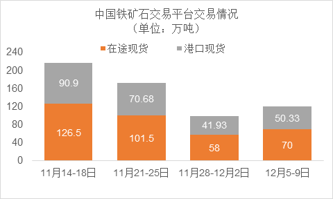 12月5日~12月9日成交50筆共120.33萬噸,其中在途7筆共70萬噸,港口43筆共50.33萬噸。主要成交品種包括:PB粉18筆共45.2萬噸,金布巴混合粉7筆共13.6萬噸,麥克粉6筆共21.8萬噸,紐曼粉3筆共11萬噸,F(xiàn)MG超特粉3筆共5.7萬噸,F(xiàn)MG混合粉3筆共3.2萬噸。