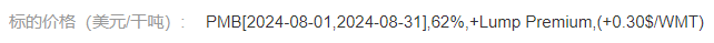 例如銷售塊礦,采用“塊礦公式5”、PMB 62%指數8月均值、結算折溢價+0.3美元,提交申報后系統顯示價格為: