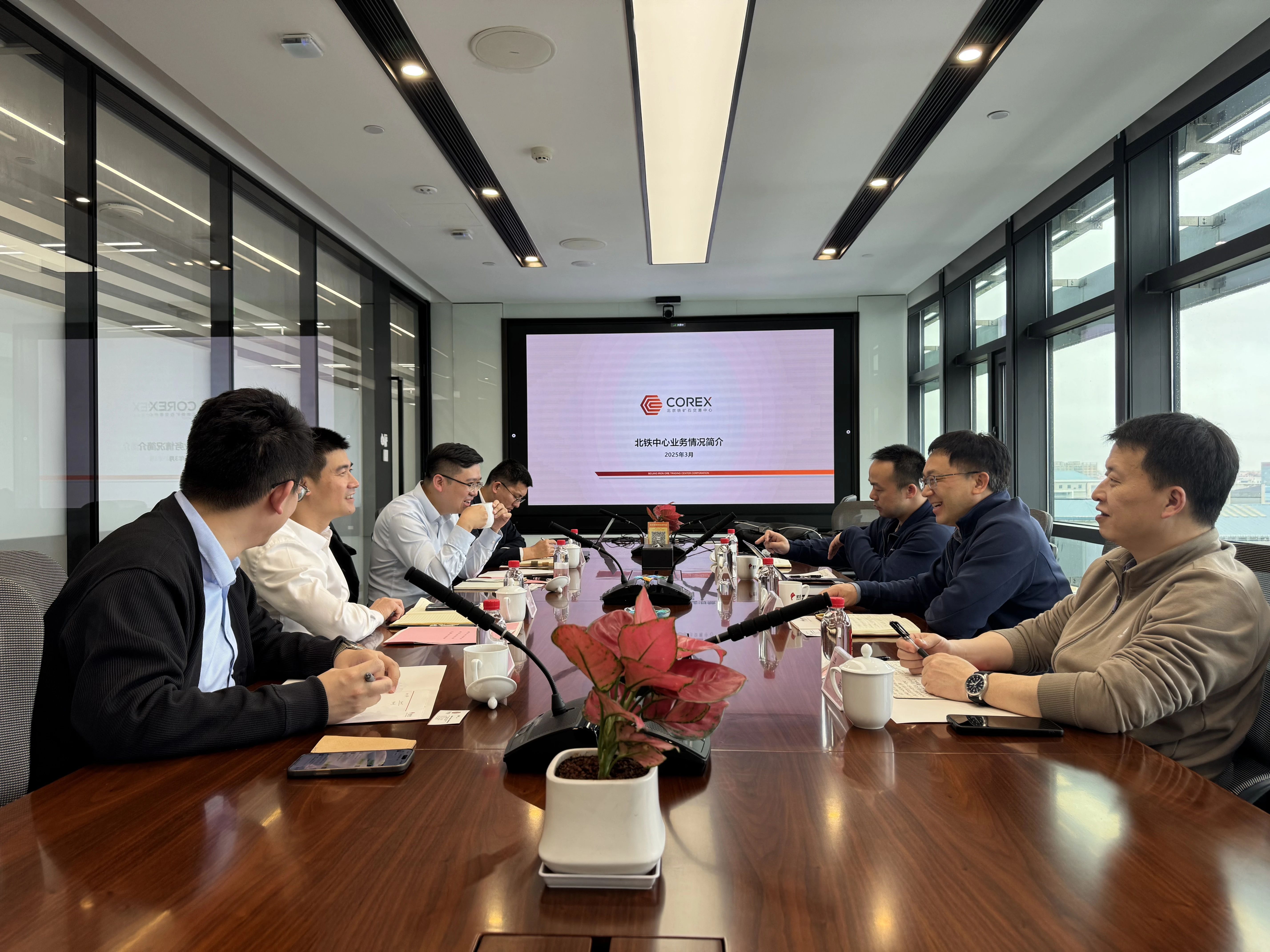 近日,北京鐵礦石交易中心(以下簡稱北鐵中心)執(zhí)行董事、總裁游松帶隊赴廈門國貿(mào)集團股份有限公司(以下簡稱國貿(mào)股份)和廈門嶼豐礦產(chǎn)有限公司(以下簡稱嶼豐礦產(chǎn)),與國貿(mào)股份黨委委員、副總裁榮坤明,國貿(mào)股份鐵礦業(yè)務集群首席商務經(jīng)理、鐵礦資源采購部總經(jīng)理李鵬,廈門象嶼股份有限公司副總經(jīng)理鄭蘆魚,嶼豐礦產(chǎn)總經(jīng)理何玉龍等座談交流。北鐵中心副總裁、董事會秘書陸昊等參加會議。