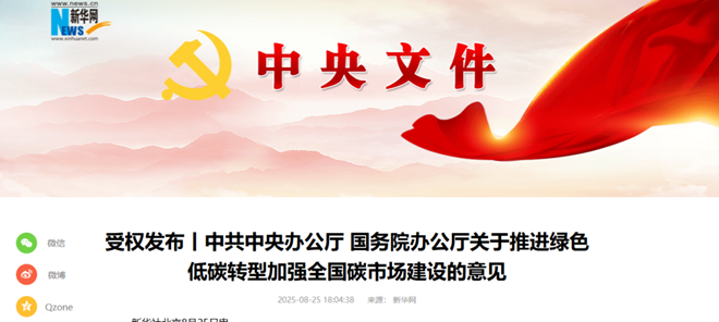 8月25日,新華網(wǎng)發(fā)布《受權(quán)發(fā)布丨中共中央辦公廳 國務(wù)院辦公廳關(guān)于推進(jìn)綠色低碳轉(zhuǎn)型加強(qiáng)全國碳市場(chǎng)建設(shè)的意見》。